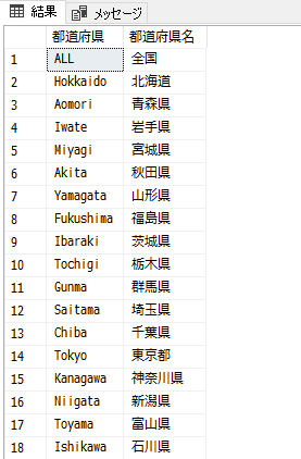 元データ上では都道府県は、ALL, Hokkaido といった英語表記で記載されていますので、まずは日本語に変換するテーブルを準備します。DDLは省略しますが、以下のような感じです。