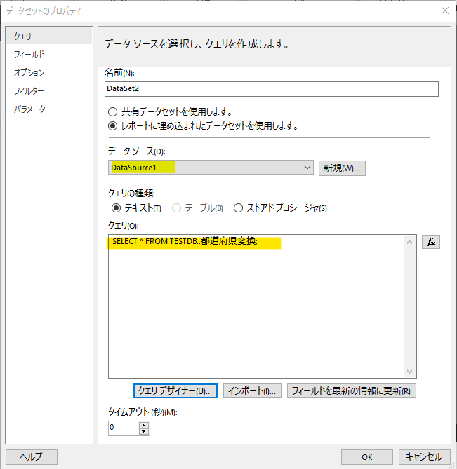 外部のデータの読み込みは、すべてデータセットを介して行う必要がありますので、まずは都道府県変換テーブルを読み込むデータセットを作成します。デザイナの左ペインのデータセットを選択して右クリック→「データセットの作成」を選択します。「データソース」を選択し、「クエリ」には作成した都道府県変換テーブルを SELECT する SQL を入力します。