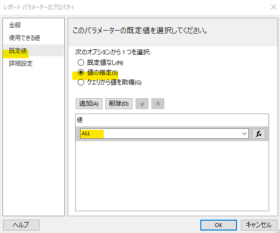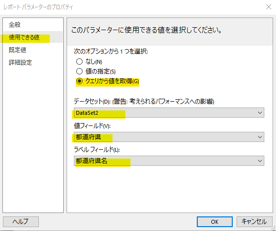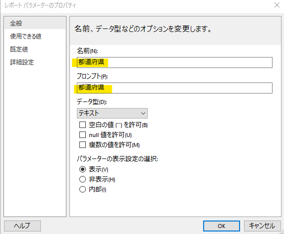 都道府県を選択するパラメータを追加します。左ペインの「パラメータ」を右クリック→「パラメータの追加」を選択してください。レポートパラメータのプロパティでは以下のように設定します。