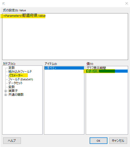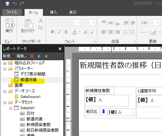 本レポートは最初から全国(都道府県=ALL)を対象に作ってきたわけですが、実際のデータは都道府県単位になっており、 本家サイトでも都道府県は選択できるようになっています。そこで、最後に都道府県をパラメータにして選択できるようにしたいと思います。