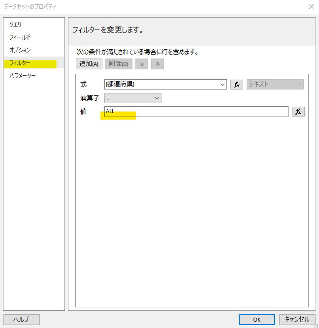 都道府県の絞り込みは「第4回」にデータセット(DataSet1)のフィルタに設定しています。このフィルタ条件をパラメータから設定するように変更していきます。