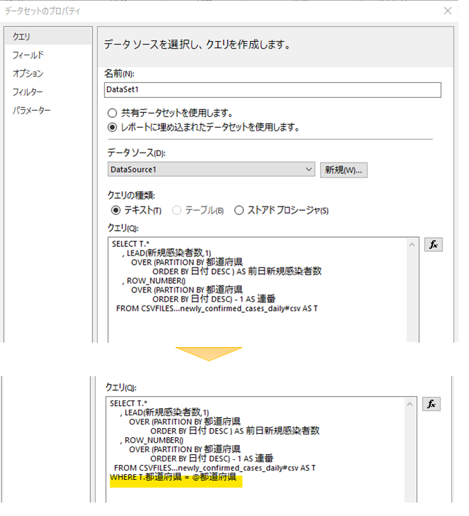 SSRS で新規陽性者数の推移グラフを作ってみる【第7回】で、都道府県の絞り込みをデータセットのフィルタで実装しましたが、クエリの WHERE 句への実装に変更したいと思います。