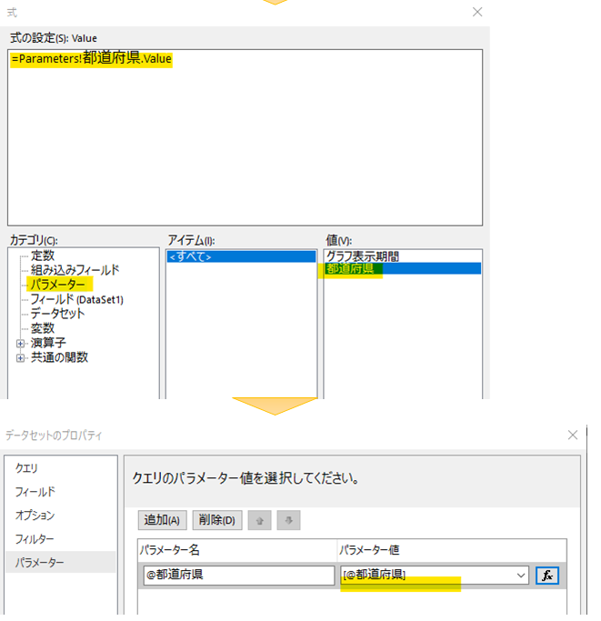 次にパラメータを開くと設定したバインド変数が追加されています。ここから「式」ボタン(fx)から「レポートのパラメータ」と紐づけます。同じパラメータという言葉ですが意味が違うので注意してください。