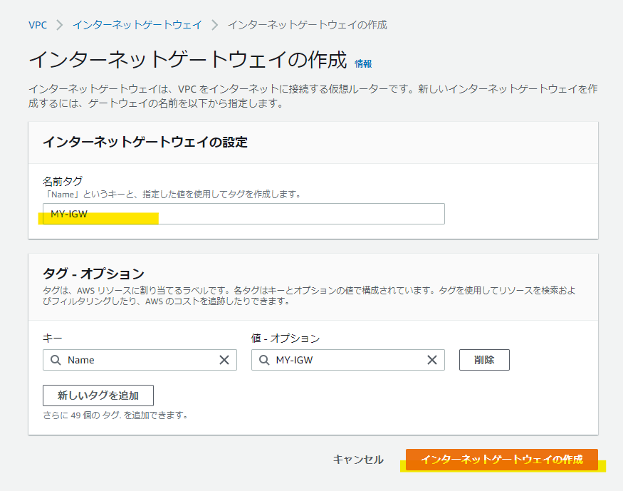 ここでは「名前」だけの入力で「インターネットゲートウェイの作成」を実行します。これでインターネットゲートウェイ「MY-IGW」が作成されます。