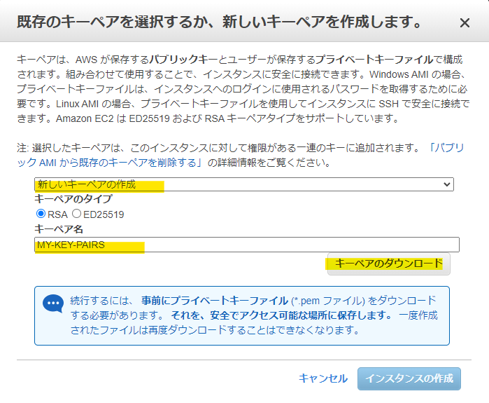 EC2 インスタンスにアクセスするためのパスワードを取得するためのキーペアを作成してダウンロードしておきます。今後、このキーペアを使うことになるのでわかりやすい名前にしておいてください。