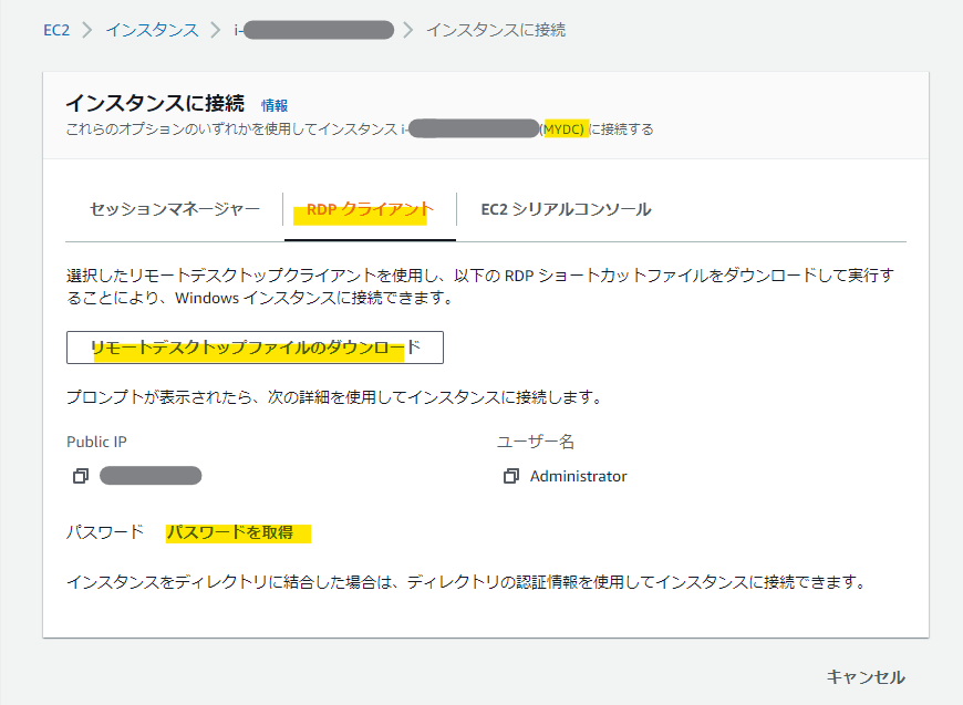 「インスタンスに接続」では「RDP クライアント」を選択し「リモートデスクトップファイルのダウンロード」を行います。これでパブリックIPv4が埋め込まれたリモートデスクトップのショートカットができます。ログイン時のユーザ名は"Administrator"です。パスワードは「パスワードを取得」をクリックして、前項でダウンロードしたキーペアファイルを使って復号させれば表示されます。