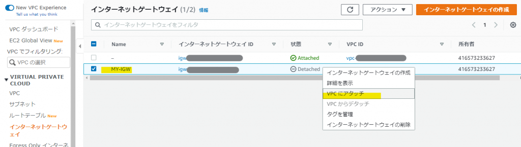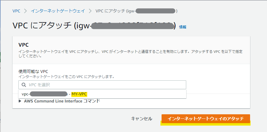 使用可能なVPCで「MY-VPC」を選択し「インターネットゲートウェイのアタッチ」を実行します。