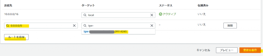 「ルートを追加」し、送信先「0.0.0.0/0」に対してターゲットに「インターネットゲートウェイ」を選択すると、先ほど作成した「MY-IGW」が選べるようになっていますので、そちらを選択後「変更を保存」を実行します。