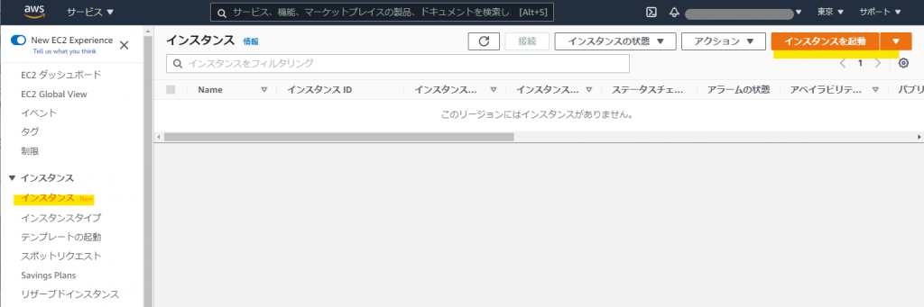 では、作成したVPC上にEC2インスタンスを作成します。「サービス」→「EC2」→「インスタンス」から「インスタンスを起動」を選択します。
