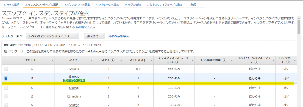 インスタンスタイプは「無料利用枠の対象」である t2.micro を選びましょう。