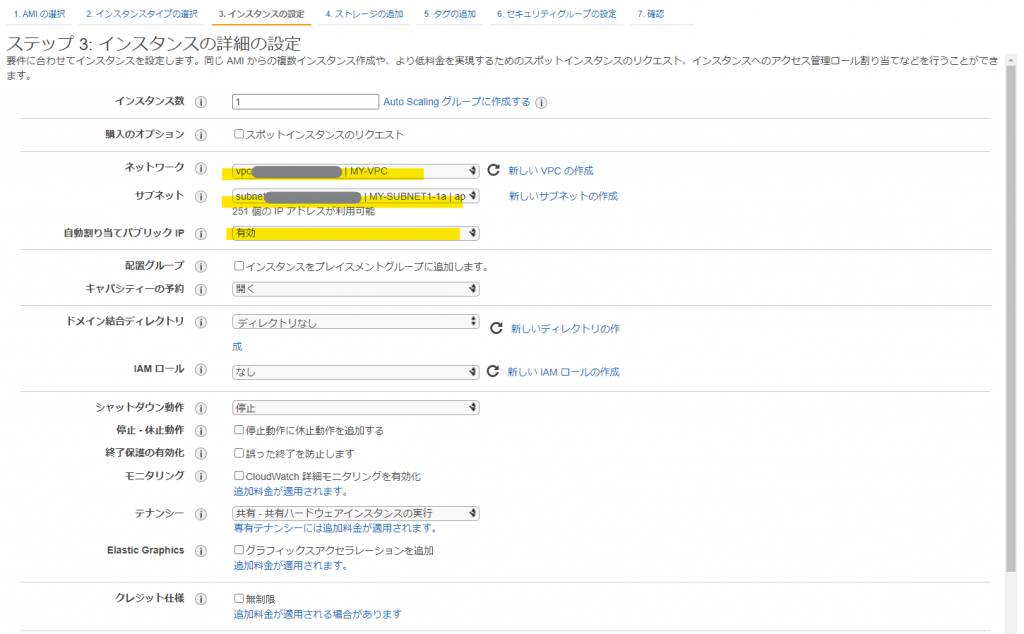 ネットワークには作成したVPC「MY-VPC」を、サブネットには「MY-SUBNET1-1a」を選択します。「自動割り当てパブリックIP」は「有効」を選択します。これにより、インターネットから EC2 インスタンスへアクセスするためのグローバルアドレスが割り当てられます。