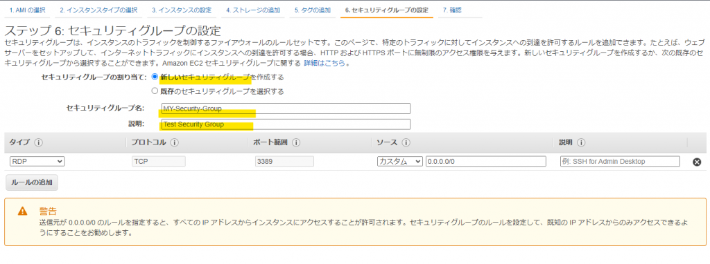 セキュリティグループについては何度も警告されます。それくらい大事なものということです。本当はきちんと考えて設定してください。「テストサーバだから侵入されても別にいいや」と考えてはいけません。バックドアを仕掛けられて、他のシステムを攻撃するための踏み台にされたりするかもしれません。被害者ではなく加害者になってしまうかもってことです。気を付けましょう。