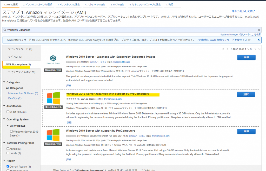 今回構築するのは Active Directory なので Windows を選択します。テスト用なので「無料利用枠の対象」となっているものから選びましょう。このイメージを"with support by ProComputers"というのは、ProComputers.com という会社がサポートしてるって意味だと思われます。"with Support by Supprted Images"は、Supported Images という会社ですね、多分。正直、イメージをどこがサポートしているかはどちらでも良いと思いますが “with Support by Supprted Images" はディスク容量が最低50Gが必要みたいで、無料利用枠30Gを目指す者としては “with support by ProComputers" 一択になろうかと思います。