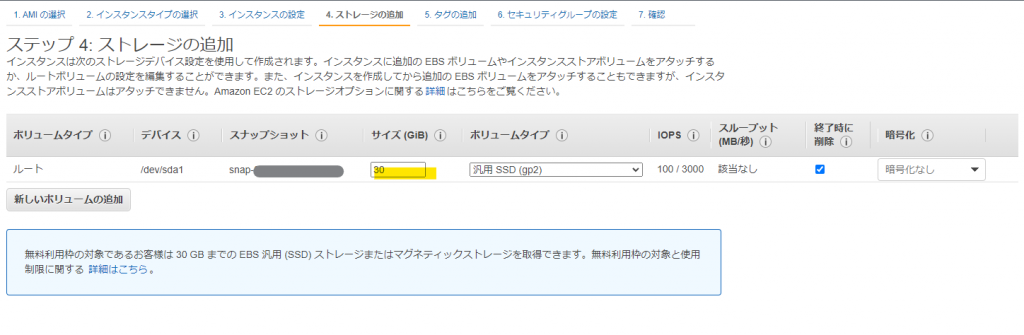 ストレージは 30G までが無料利用枠なのでサイズを 30 のままで「次のステップ:タグの追加」を選択します。