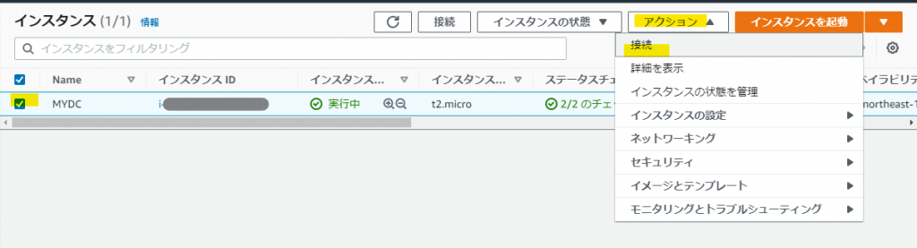 「キーペアのダウンロード」をすると「インスタンスの作成」が選択できるようになりますので実行します。インスタンス作成には最低でも数分はかかります。以下のような状態になれば恐らく接続可能になっていると思います。