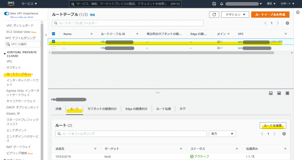 前項で作成した VPC「MY-VPC」にはデフォルト値でルートテーブルが作成されています。ここには内部ネットワークに対するルートの定義しかありませんので、先ほど定義したインターネットゲートウェイ「MY-IGW」を経由して外に出られるような定義を追加します。「サービス」→「VPC」→「ルートテーブル」から VPC が「MY-VPC」と関連付いているルートテーブルを選択し「ルートを編集」を実行します。
