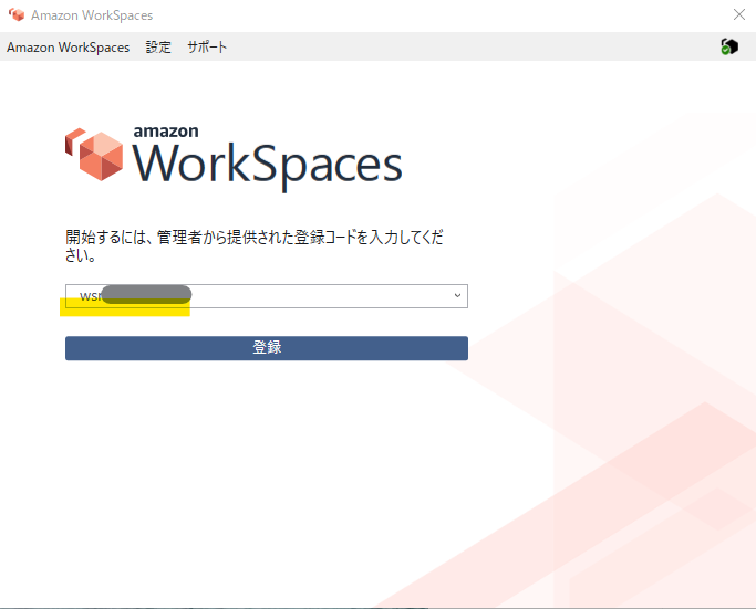 WorkSpaces クライアントを起動し、確認した「登録コード」を入力します。