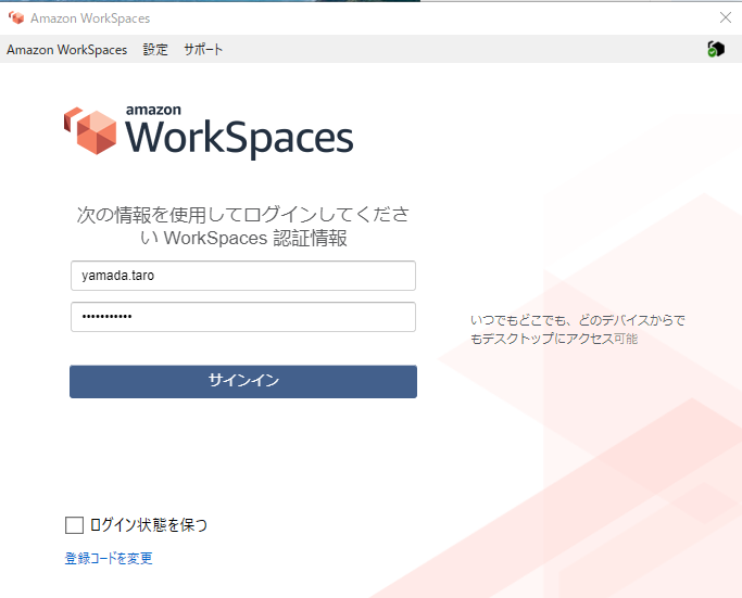 あとはユーザID、パスワードを入力すれば WorkSpaces に接続できます。