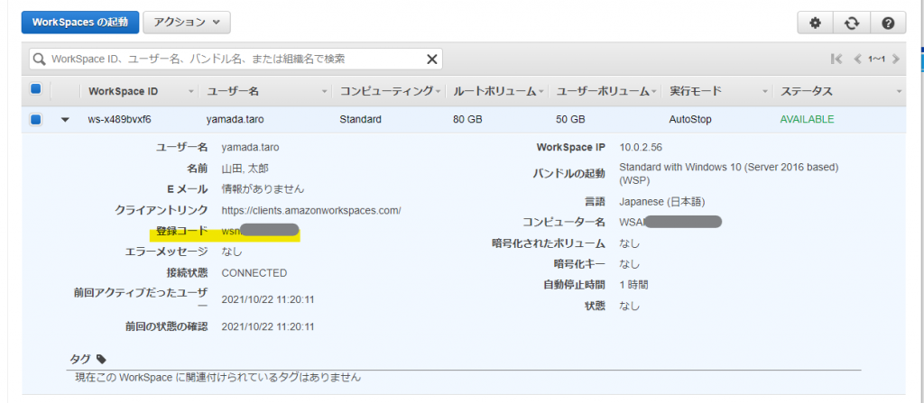 次に AWS コンソールより、WorksSpaces の登録コードを確認します。WorkSpaces クライアントから接続するときに必要なコードです。