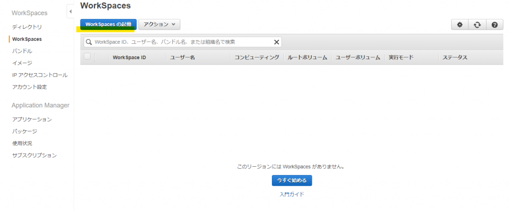AWSコンソールにて「サービス」→「WorkSpaces」を選択します。以下の画面から「WorkSpaces の起動」を実行します。