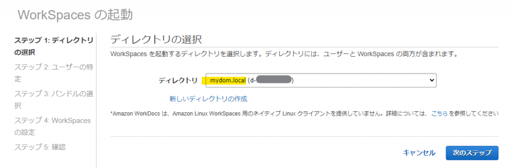 次に、前回作成した AD Connector として作成したディレクトリ「mydom.local」を選択します。