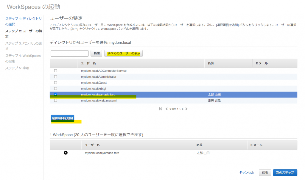 次にログインできるユーザを選択します。「すべてのユーザーを表示」とすれば、選択した AD Connector 経由で「AWS EC2 でドメインコントローラ構築【第2回】」の最後に登録したテスト用のユーザが表示されます。この中で yamada.taro を選択し「選択項目を追加」として「次のステップ」へ進みます。