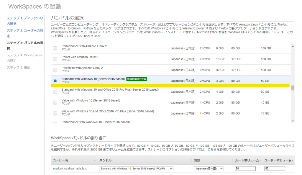 バンドルは無料利用枠の対象の「Windows 10 Japanese」を選択します。ちなみに WorkSpaces では Windows10 といっても中身は Windows2016 です。