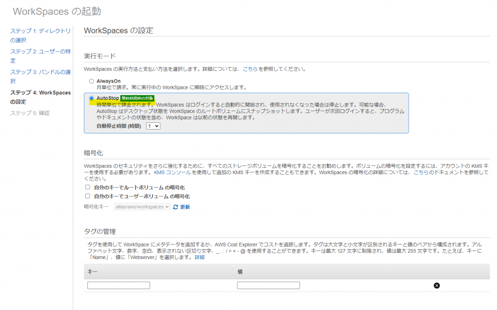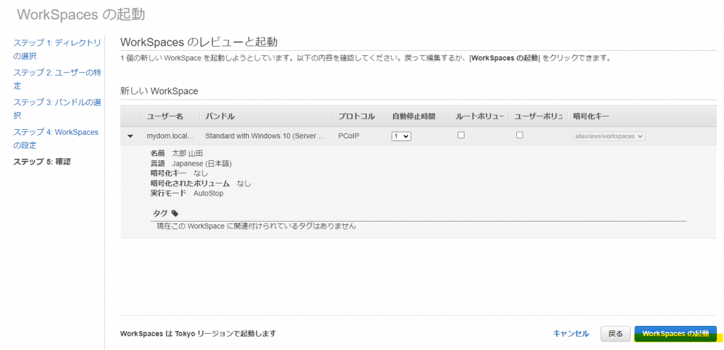 WorkSpaces の設定は必要に応じて設定は変えてください。起動モードは「AutoStop」じゃないと課金されそうですね。今回はそのままにしています。
