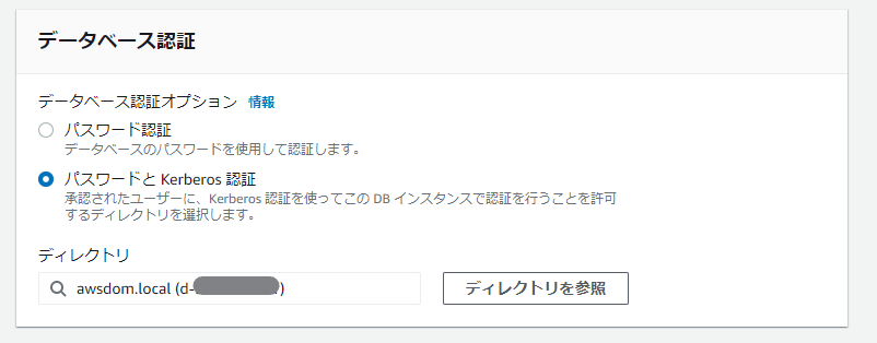 データベース認証オプションを「パスワードと Kerberos 認証」としてください。ディレクトリは「AWS Microsoft AD と既存 AD との信頼関係」で作成したドメイン「awsdom.local」を選択します。