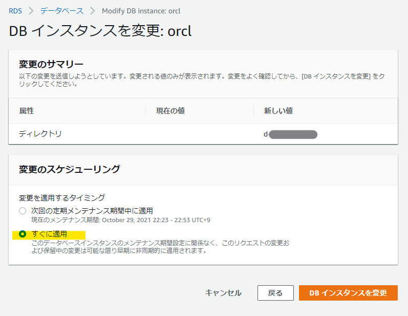 「続行」して変更点を確認し「変更のスケジューリング」を「すぐに適用」を選択した上で「DB インスタンスを変更」を実行します。