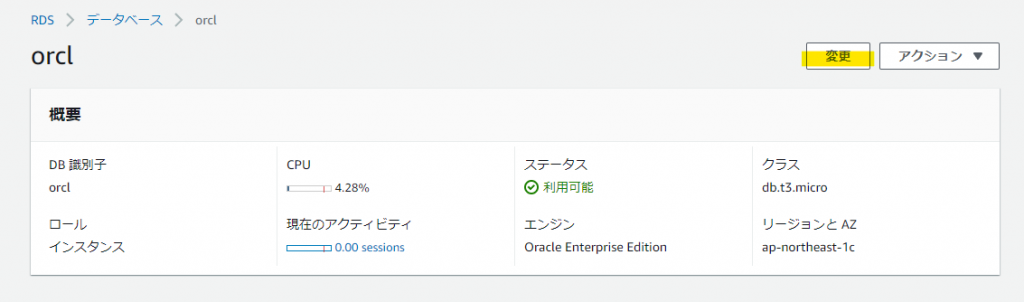 AWS コンソールで作業します。「RDS for Oracle の Kerberos 認証」で作成したインスタンス「ORCL」を選択し「変更」を実行します。
